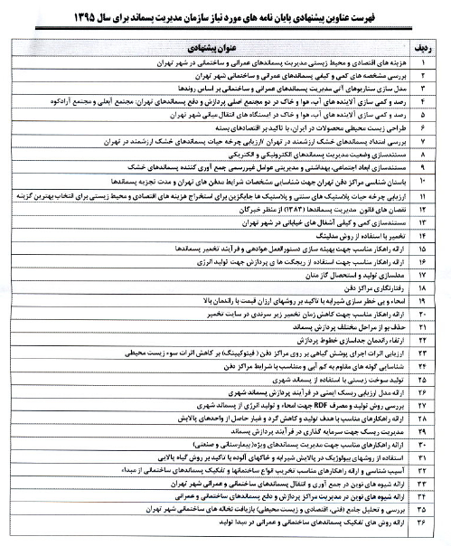به اطلاع پژوهشگران محترم میرساند سازمان مدیریت پسماند در راستای بهبود سطح خدمات رسانی از پایان نامه ها و رساله ها با موضوعات ذیل حمایت می نماید.لذا علاقه مندان می توانند جهت کسب بیشتر به وب سایت مرکز مطالعات و برنامه ریزی شهر تهران مراجعه نمایند.