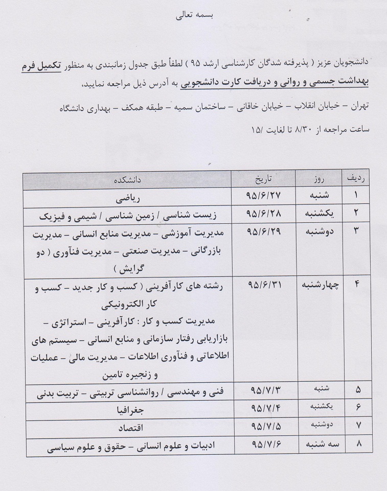 اطلاعیه زمانبندی دریافت کارت دانشجویی و فرم بهداشت جسمی و روانی